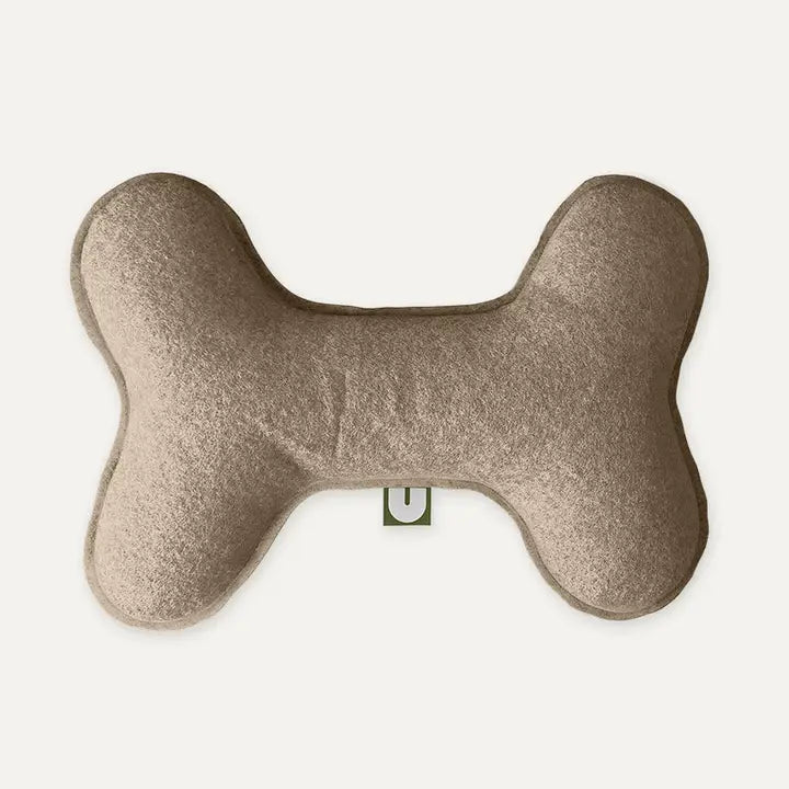 Jouet rembourré en forme d'os en tissu recyclé et rempli de fibres recyclées provenant de bouteilles en plastique.